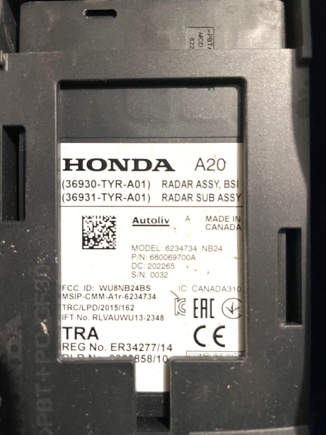 This is the right side rear blind spot radar for a 2020 Acura MDX in good working condition.